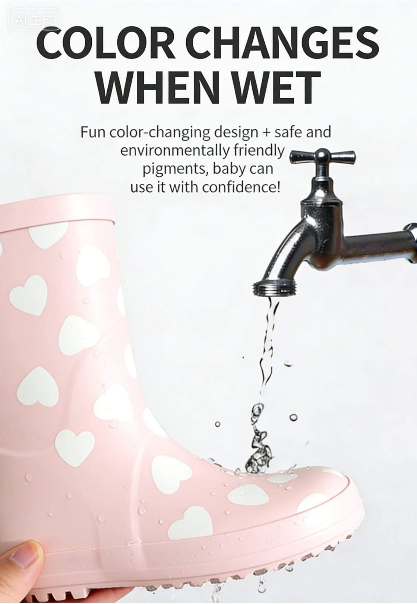 Magically change color when wet! Made with safe, eco-friendly pigments, 100% waterproof rubber, non-slip sole, and soft lining. Perfect for kids to enjoy rainy days with fun and safety.