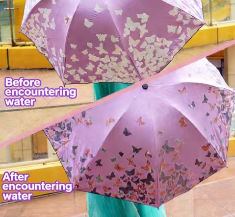 Magic color-changing umbrella with water-activated design, waterproof and UV protective, lightweight and durable for all-weather use.